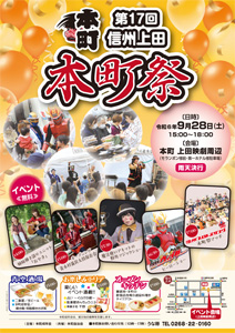 私共、本町成年会では『人の集まる街づくり』をテーマとして、本町自治会、本町内の飲食店・事業者の皆様、さらには、市内企業の皆さまにご協力いただき、この本町という街の特色を最大限に活かし、裏路地本町が上田市中心市街地活性化の起爆剤となればとの思いから活動してまいりました。その活動の一端として「本町で宝を探そう」を合言葉に『信州上田本町祭』を毎年1回開催しております。このお祭りも今回で18回目を迎えました。